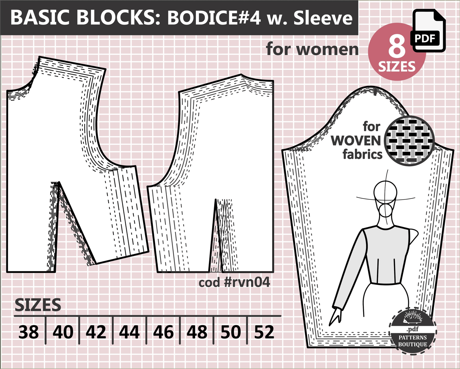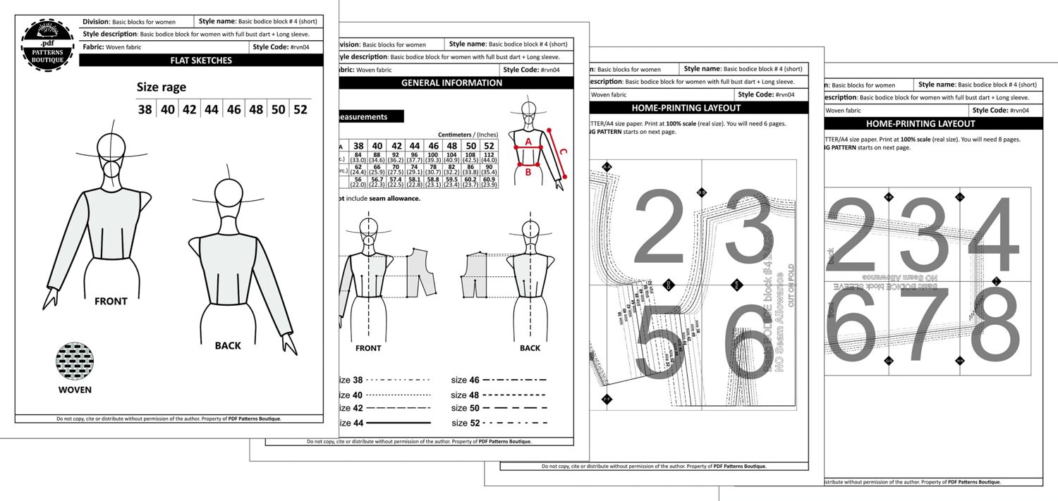 Basic BODICE BLOCK & SLEEVE for Women / PDF Sewing Pattern / 8 Sizes: 38 to 52 (Italian) / Instant Download