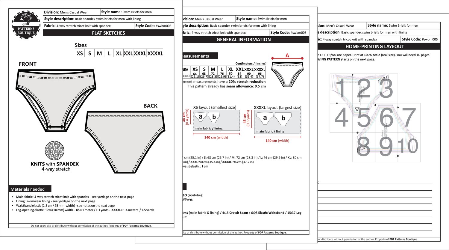 PDF Printable Sewing Pattern: Basic SWIM BRIEFS with Lining for Men.