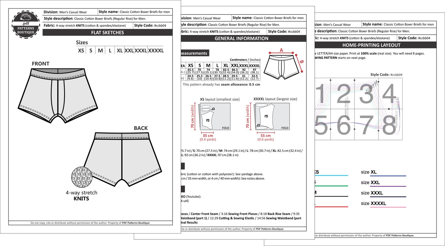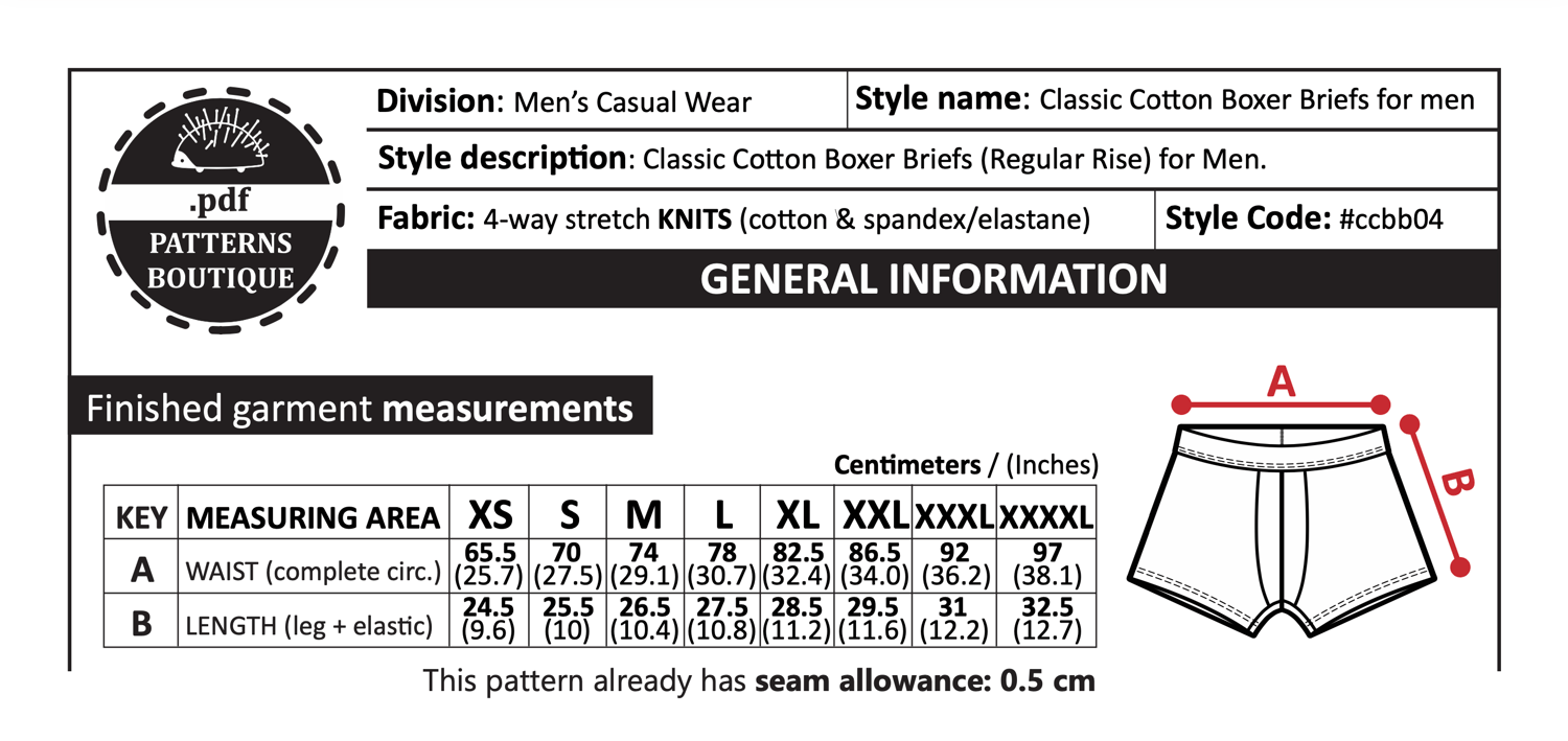 PDF Printable Sewing Pattern: CLASSIC COTTON BOXER BRIEFS (Regular-Fit)