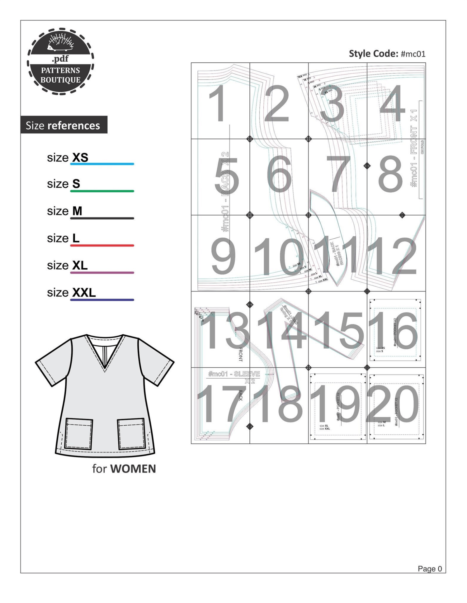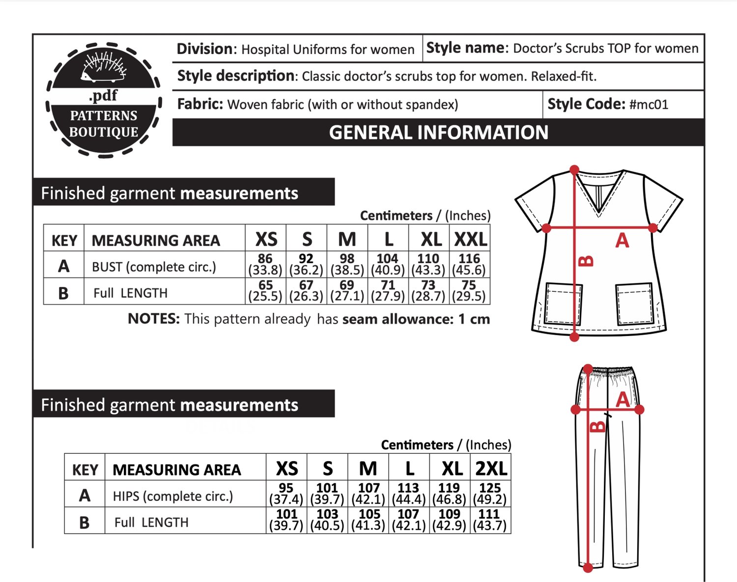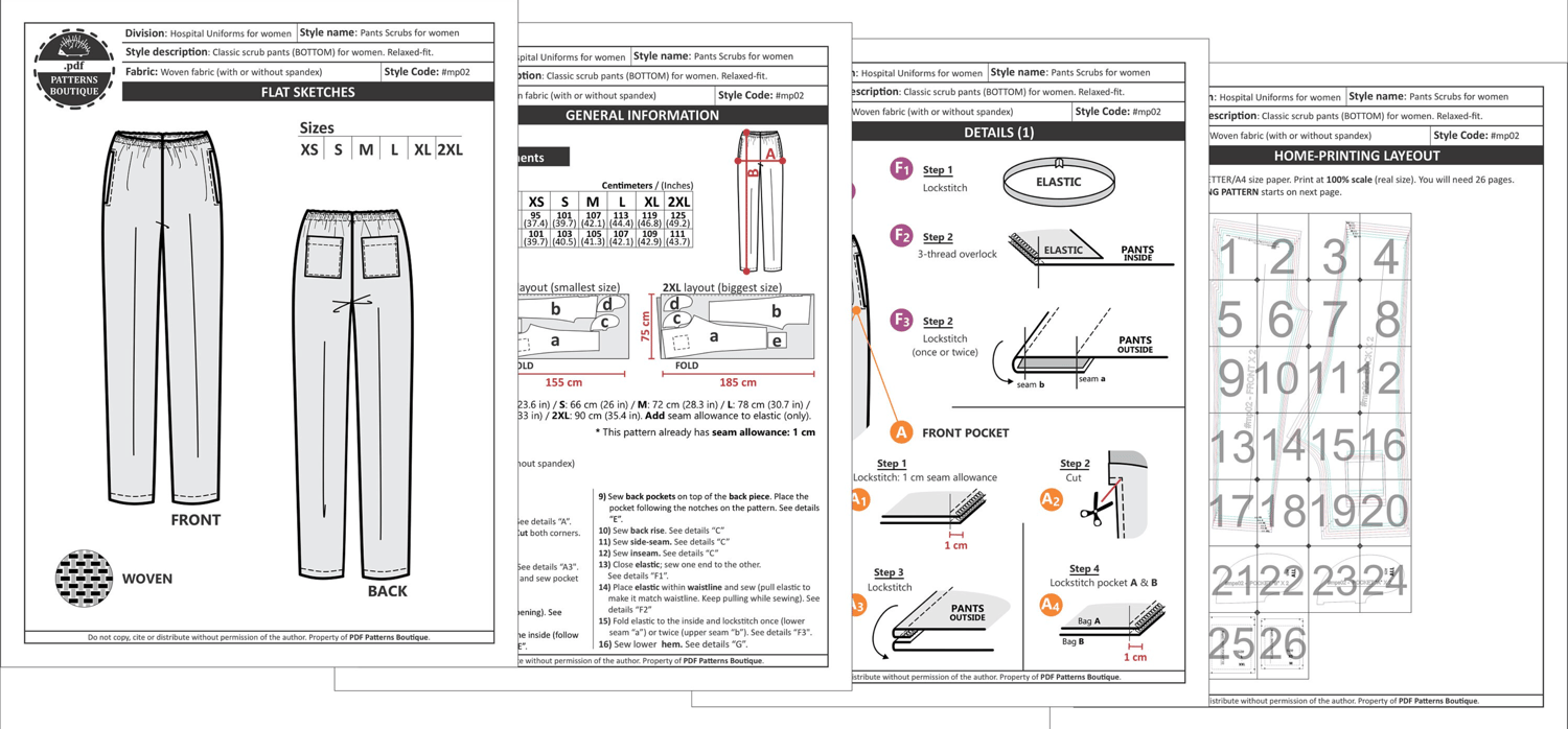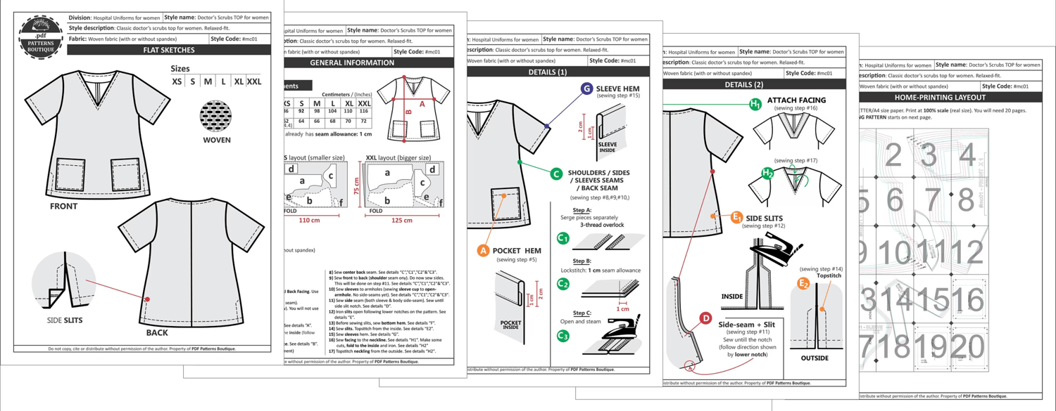 PDF Printable Sewing Pattern. Healthcare uniform: TOP + PULL-ON PANTS. Relaxed Fit Scrubs for Women