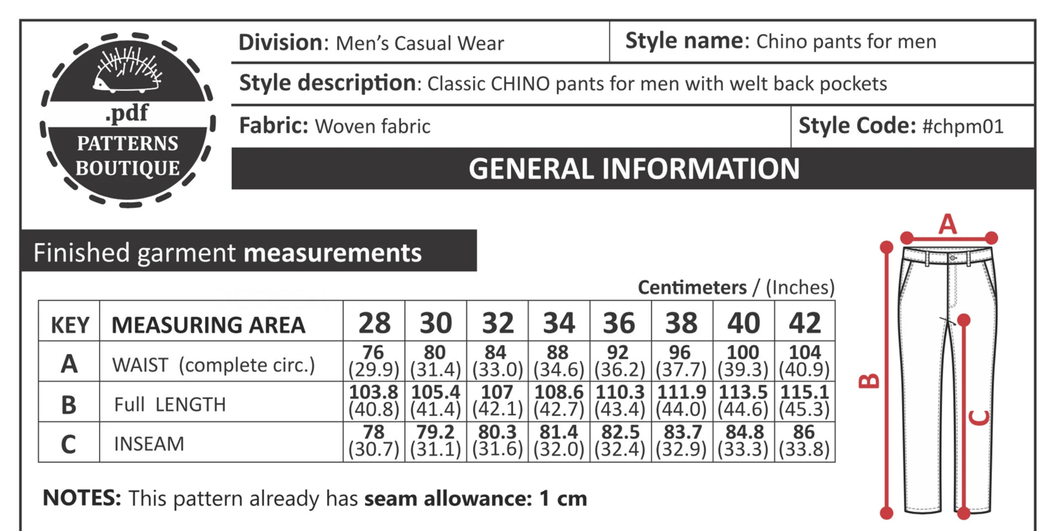 PDF Printable Sewing Pattern: CHINO PANTS / KHAKI PANTS. Regular fit