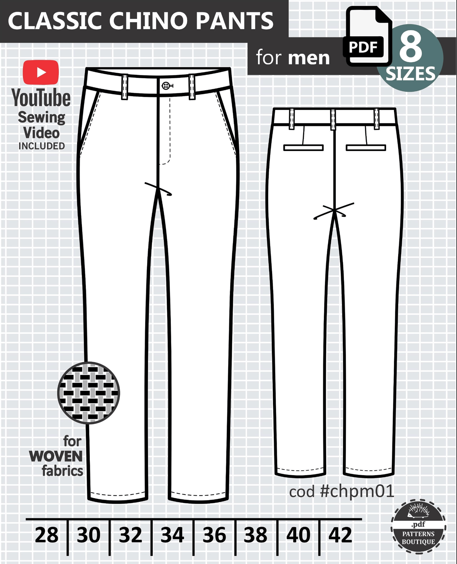 CHINO PANTS for Men / PDF Sewing Pattern & Youtube Video / Khaki Pants / 8 Sizes: 28 to 42 / Instant download