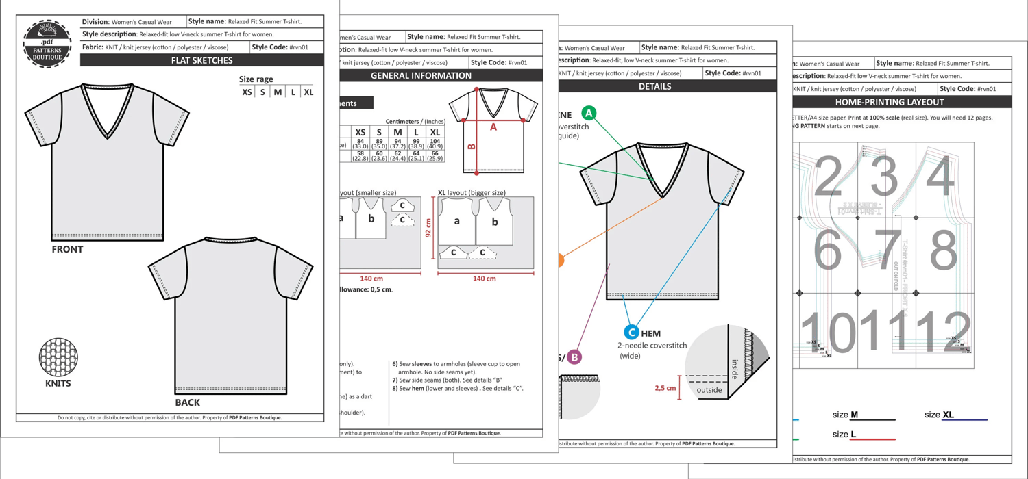 PDF Printable Sewing Pattern: RELAXED-FIT V-NECK T-SHIRT with Short Sleeves.