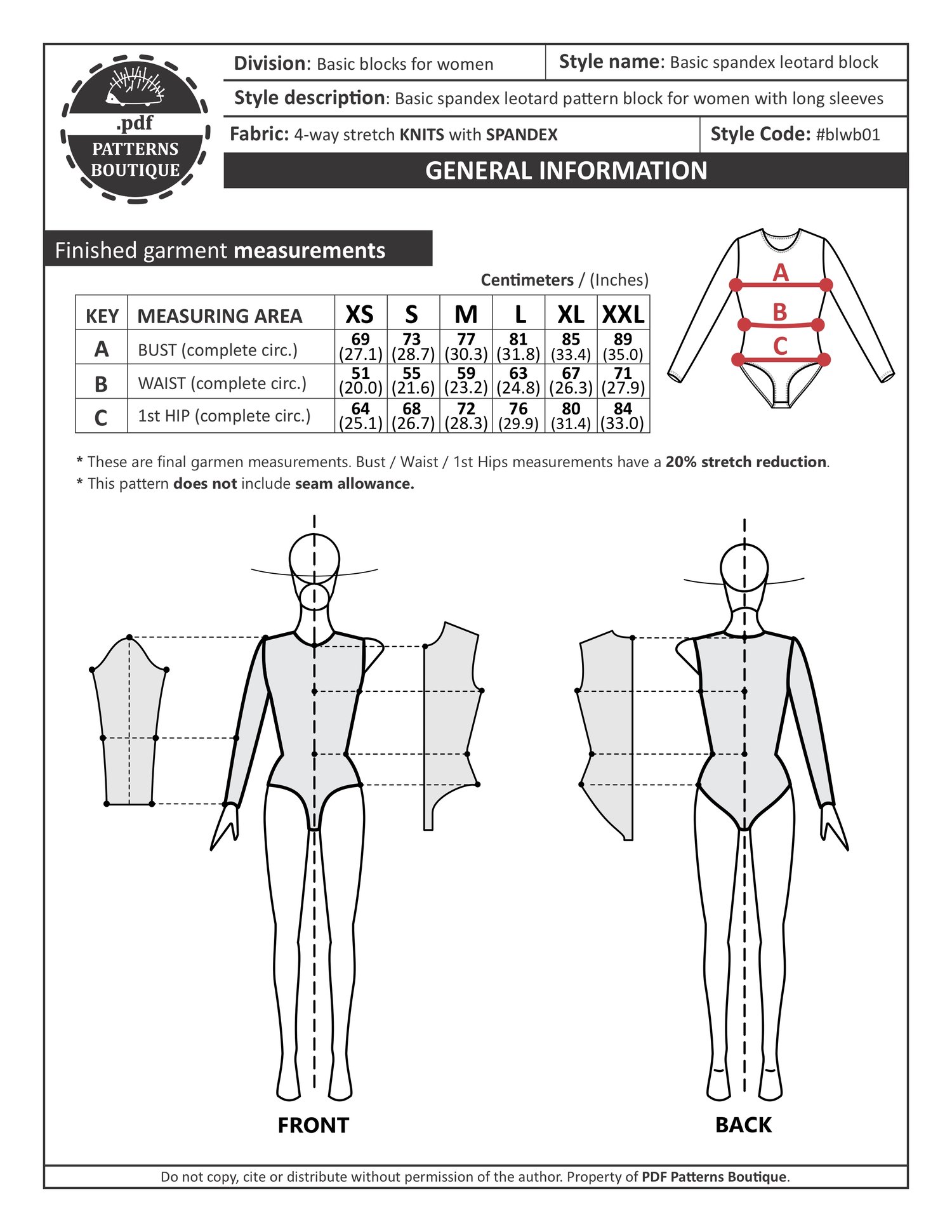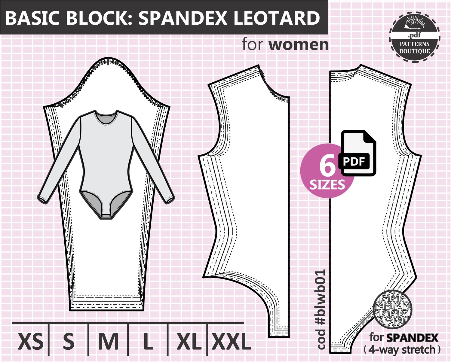 LEOTARD BLOCK with SLEEVE – for Knit Fabrics (Spandex) | PDF Sewing Pattern | 6 Sizes: XS–XXL | Instant Download