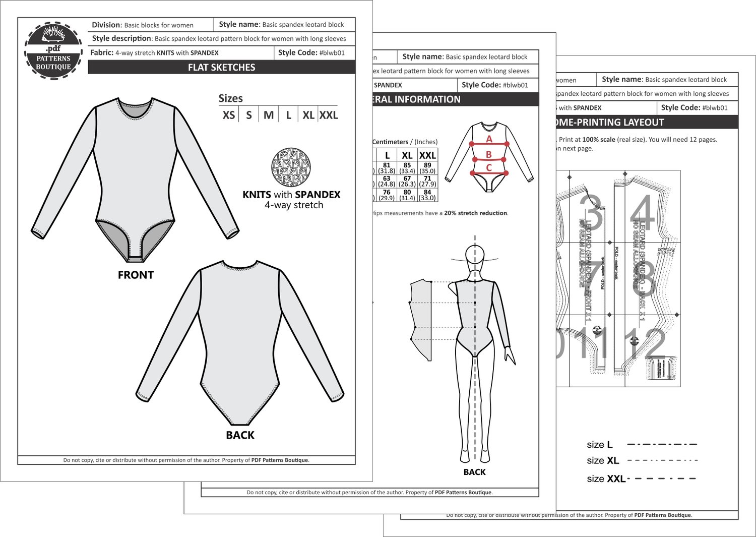 PDF Printable Sewing Pattern. Basic Leotard Sloper / Block for Knit Fabrics (Spandex) with Long Sleeves for Women