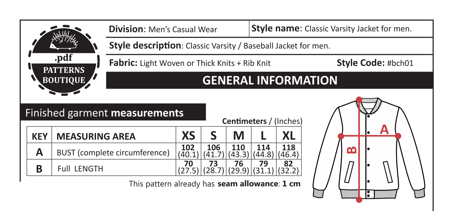 PDF Sewing Pattern: CASUAL VARSITY / BASEBALL / FOOTBALL / UNIVERSITY - COLLEGE JACKET: Relaxed-fit for Men