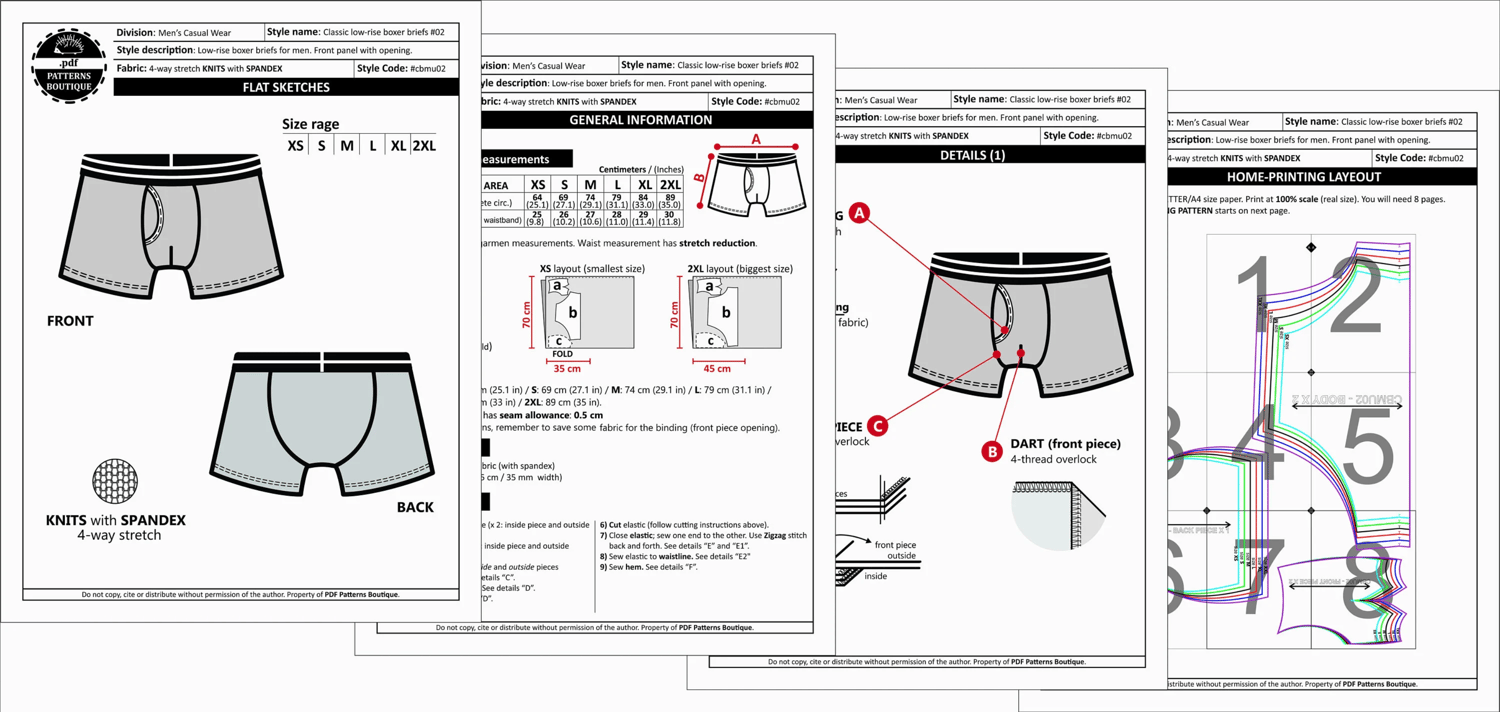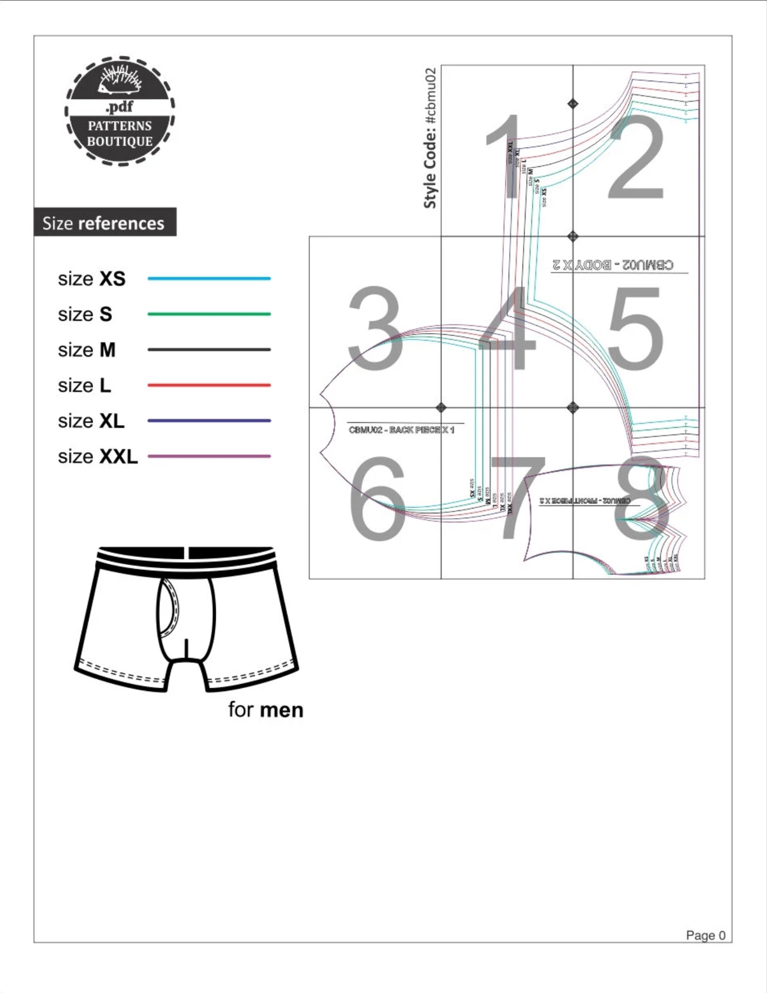PDF Printable Sewing Pattern. MEN'S UNDERWEAR: BOXER. Low waist / Low rise.