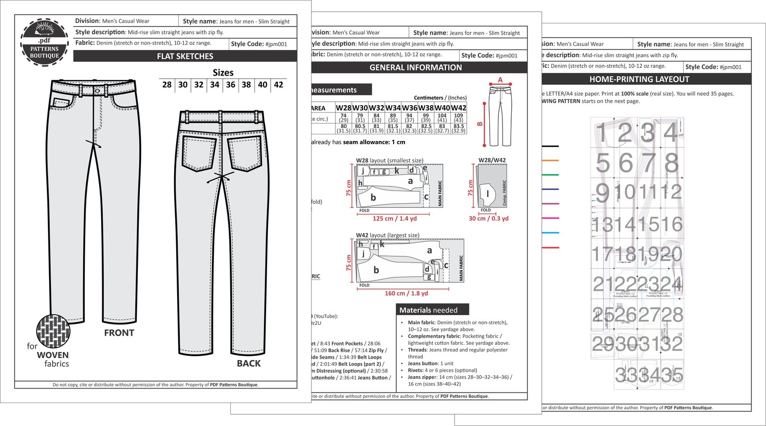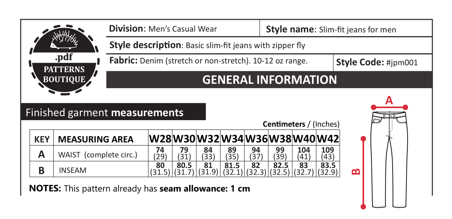 PDF Printable Sewing Pattern: Mid-Rise Slim Straight Jeans for Men
