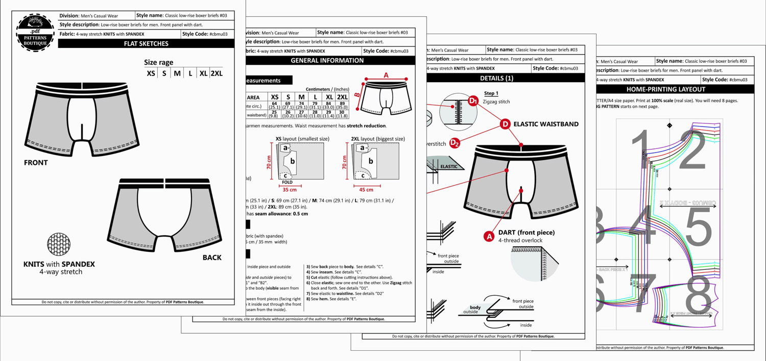 PDF Printable Sewing Pattern. MEN'S UNDERWEAR: BOXER. Low waist / Low rise.