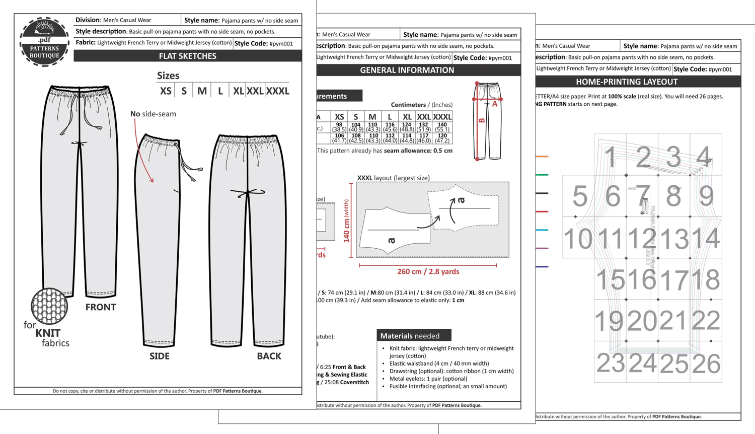 PDF Printable Sewing Pattern. PAJAMA / PYJAMA PANTS with no side seams: Classic fit for men